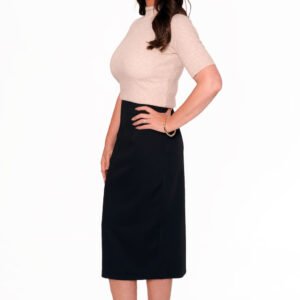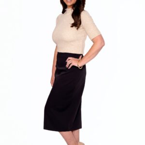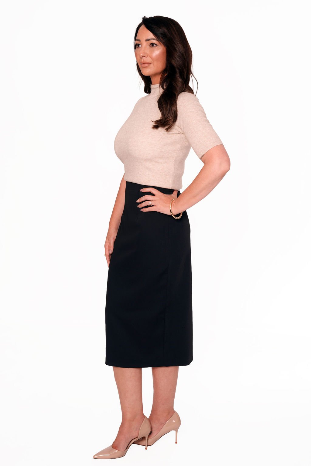 Elevate your professional wardrobe with this timeless, high-waist pencil skirt in black. Designed to accentuate the natural waistline, it offers a sleek, figure-flattering silhouette that falls gracefully to the knee. The structured fit and smooth finish create a polished look, perfect for office wear or formal occasions. Crafted from premium stretch fabric, it ensures both comfort and ease of movement throughout the day. Pair it effortlessly with a blouse or blazer for a sophisticated ensemble.