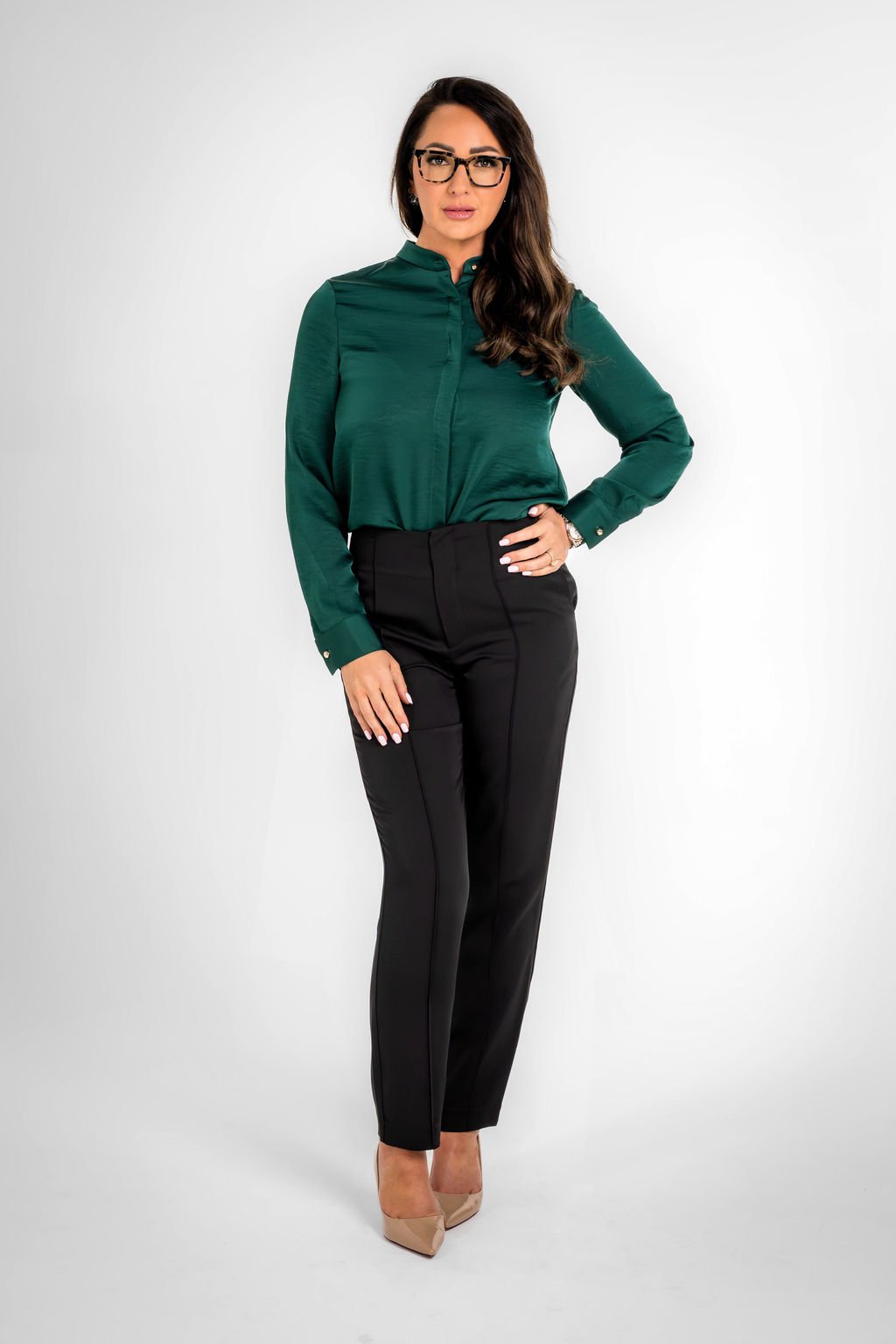 Available in classic ivory, olive and deep navy, this versatile blouse brings a subtle shine and sophistication to every outfit.