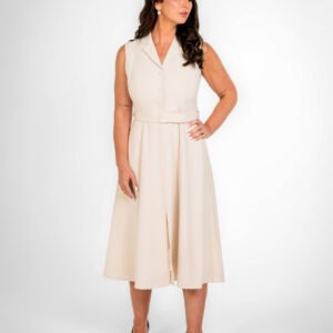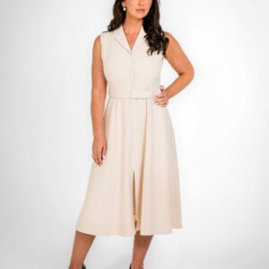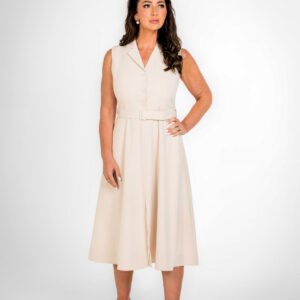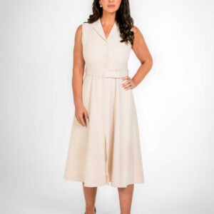 Featuring a fitted bodice, collared neckline, and a beautifully flared skirt, this dress moves gracefully with you. The waist-defining belt adds a refined finish, while hidden side pockets offer practicality without compromising elegance. Designed for versatility, it transitions effortlessly from office hours to after-work occasions.