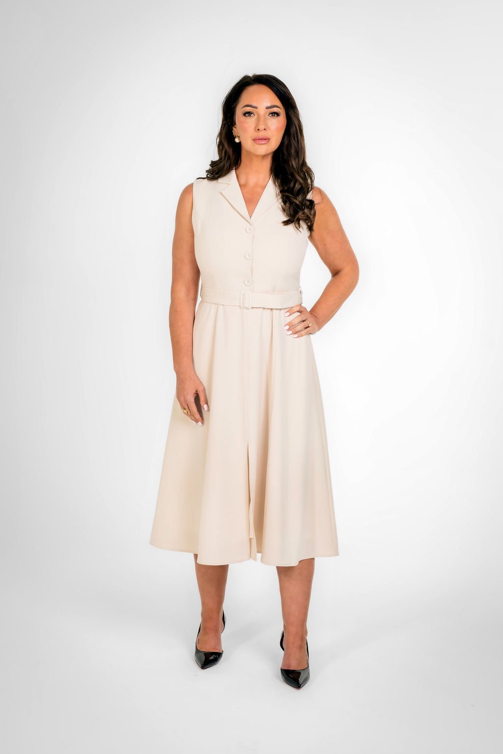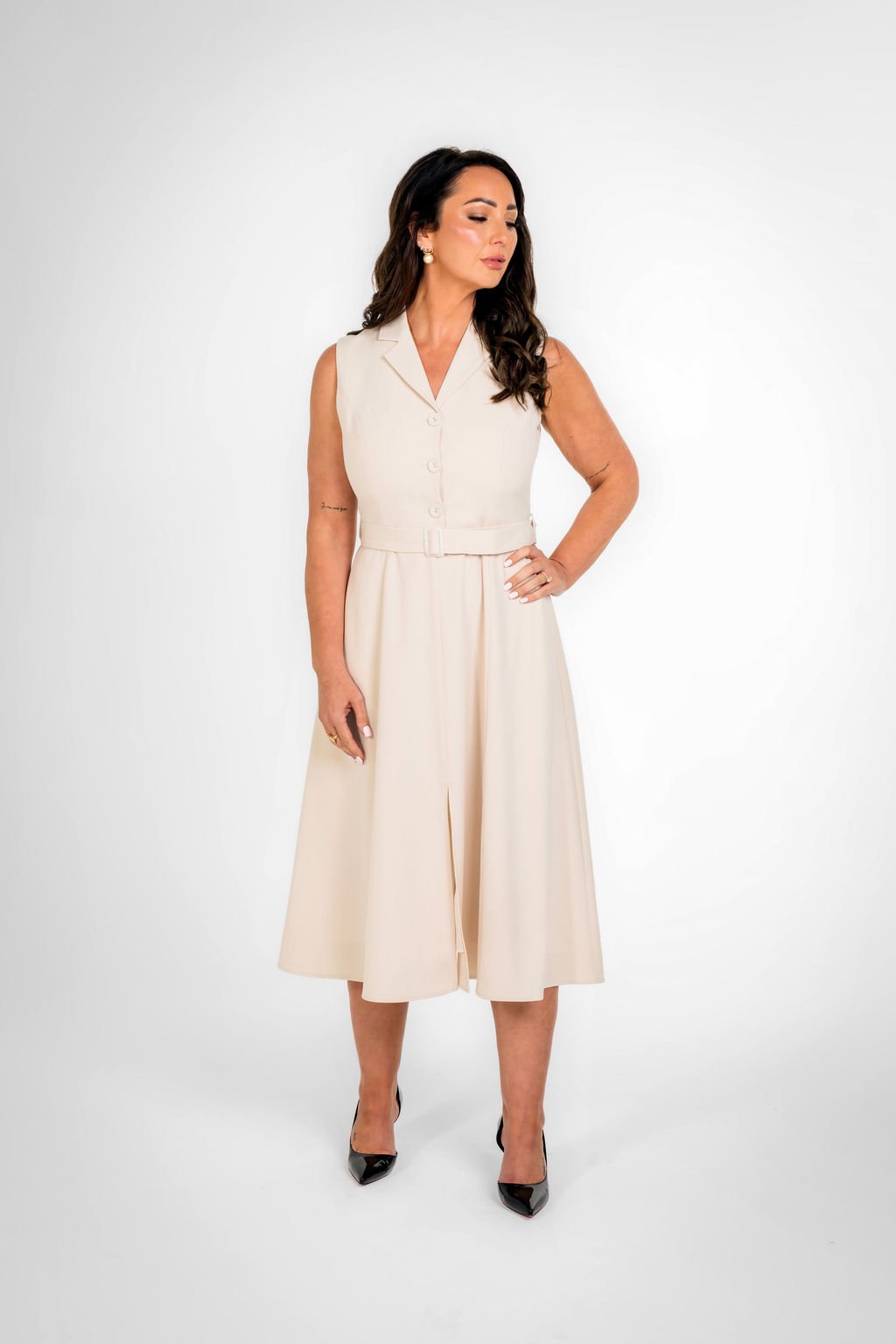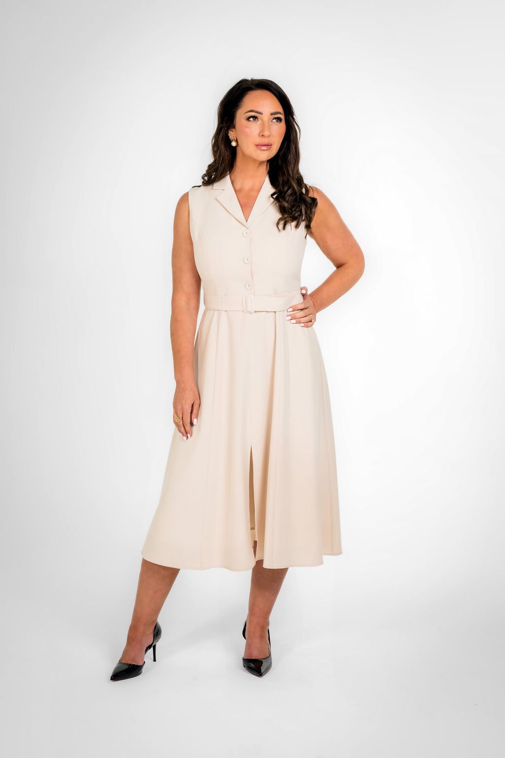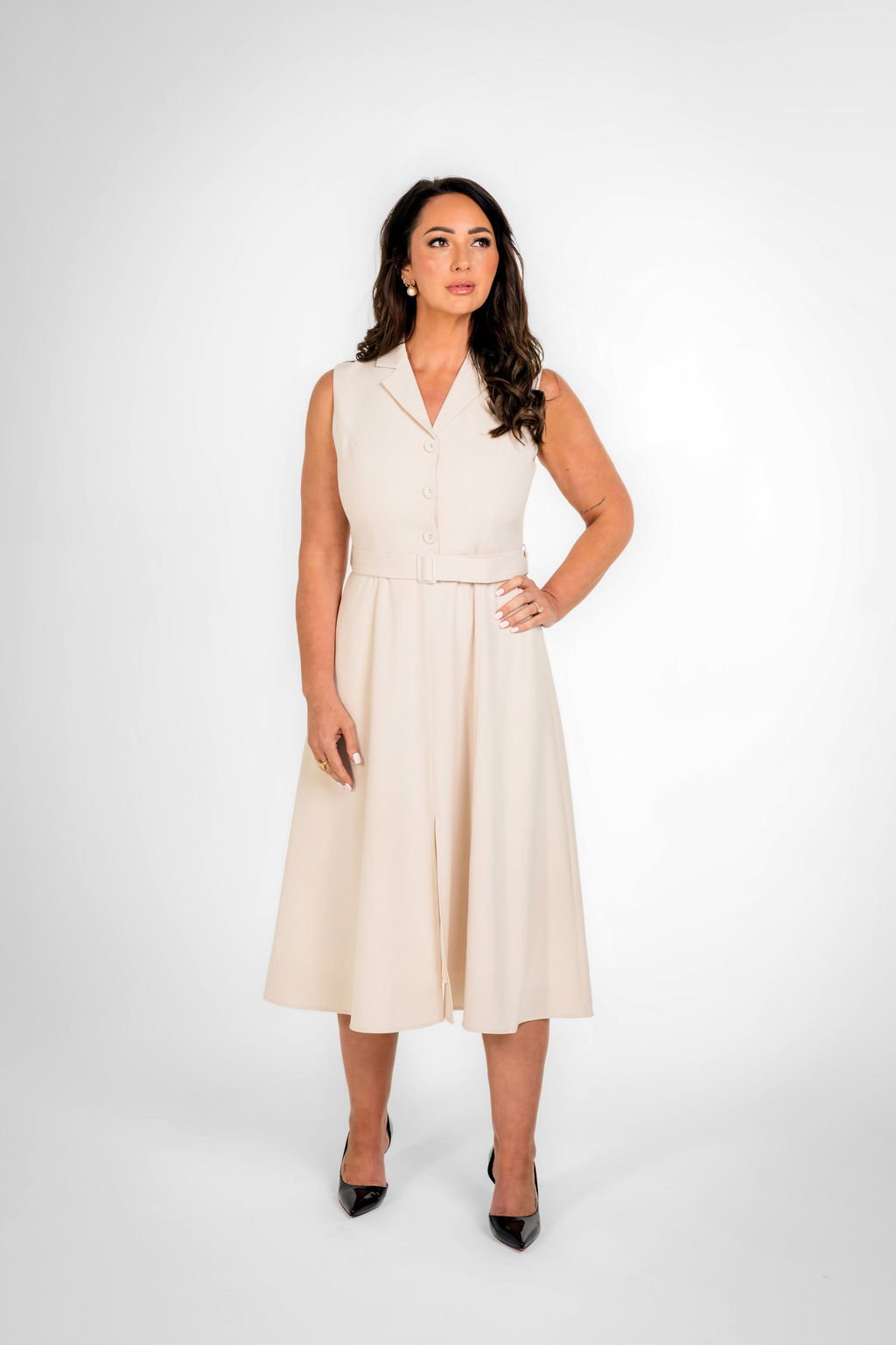 Paris Oatmeal Sleeveless Belted Midi Dress