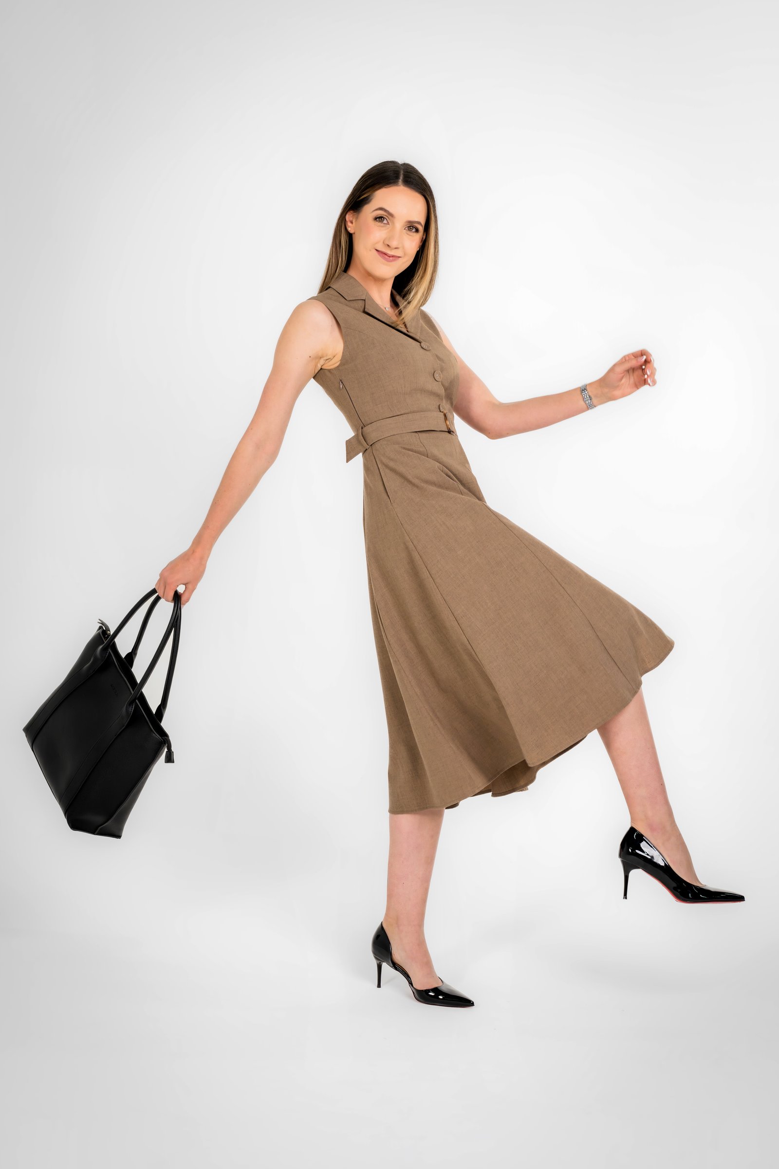 Featuring a fitted bodice, collared neckline, and a beautifully flared skirt, this dress moves gracefully with you. The waist-defining belt adds a refined finish, while hidden side pockets offer practicality without compromising elegance. Designed for versatility, it transitions effortlessly from office hours to after-work occasions.