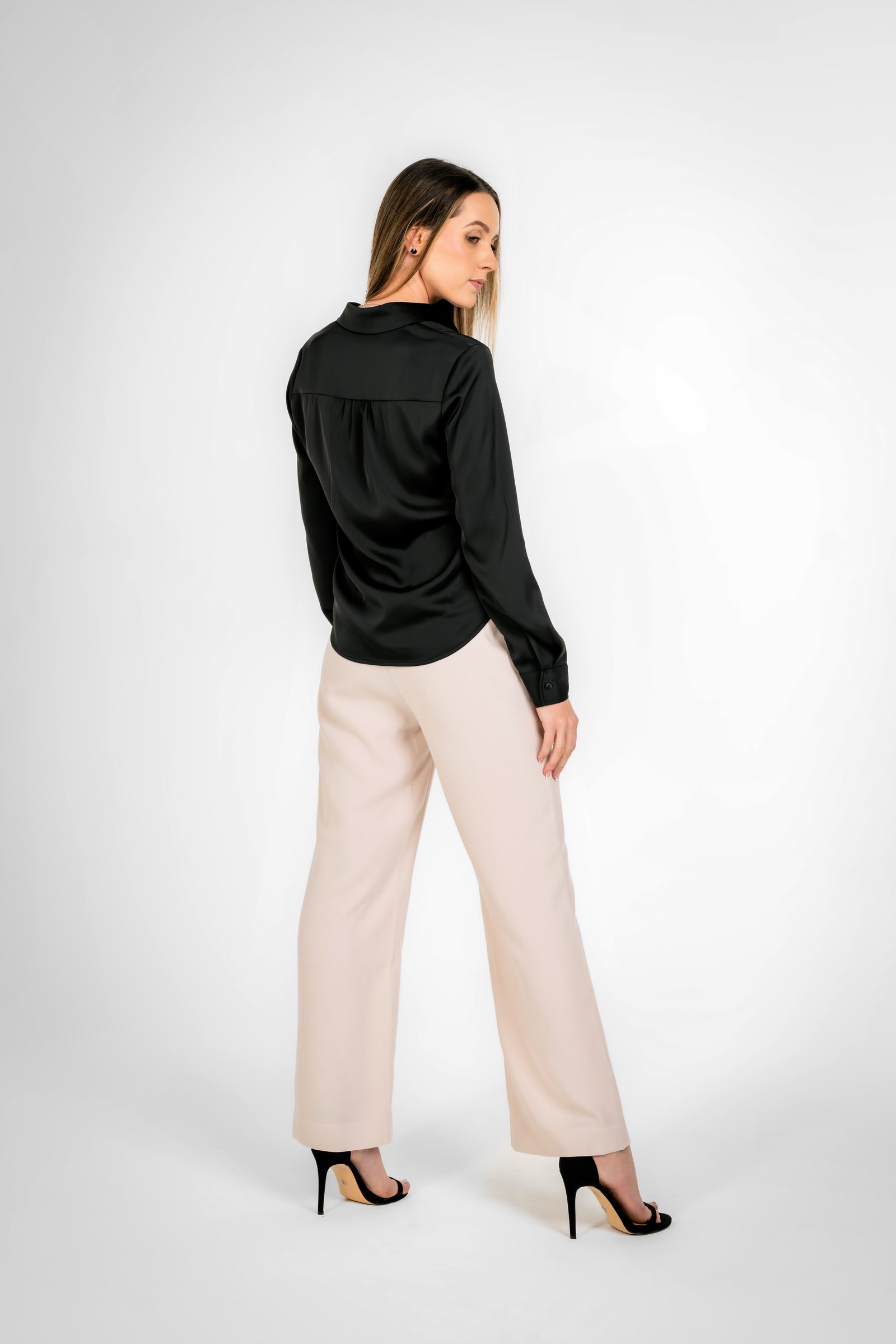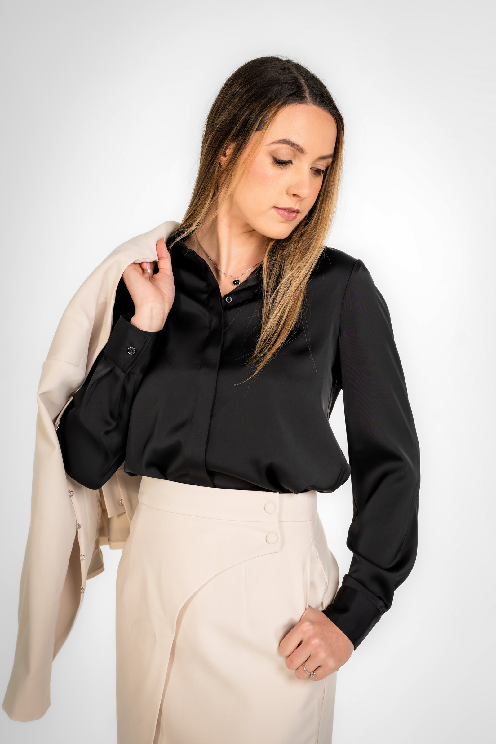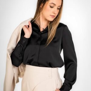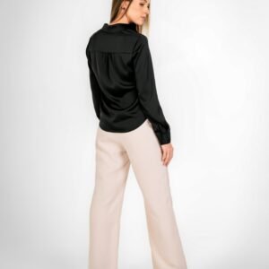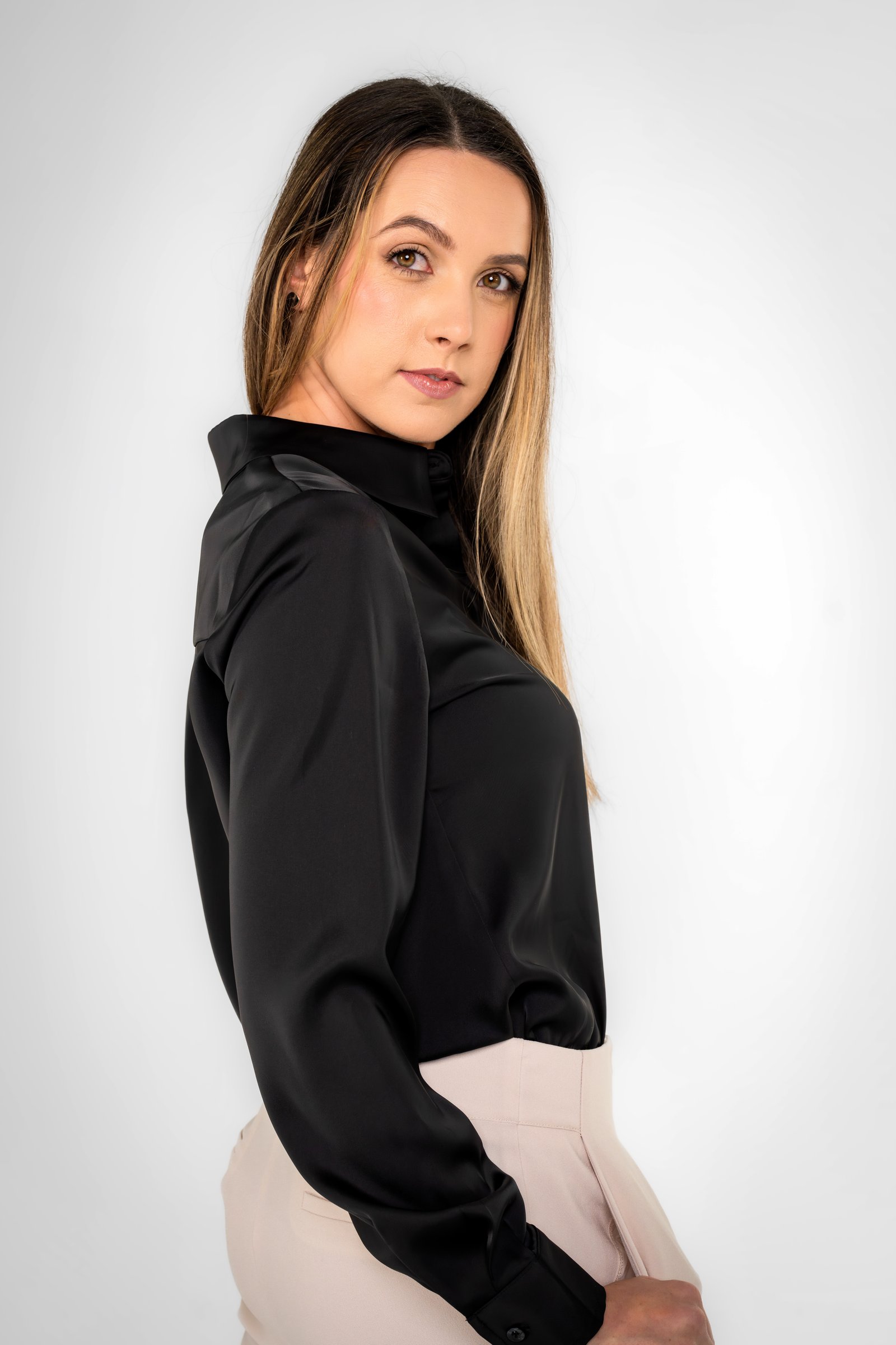 The classic collared neckline and long-sleeve design make it an ideal choice for both professional and after-hours looks. Its lightweight drape enhances comfort and movement, while the minimalist tailoring delivers a sleek, body-flattering silhouette. Whether tucked into tailored trousers or paired with a pencil skirt, this versatile shirt embodies modern femininity with an executive edge.