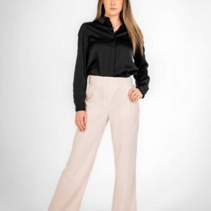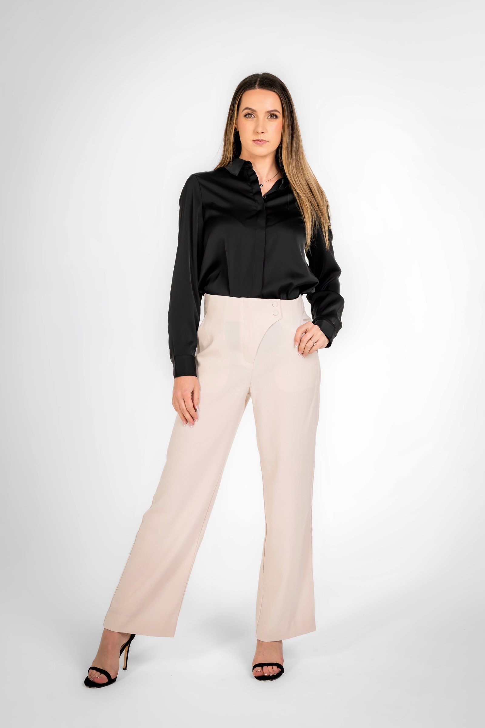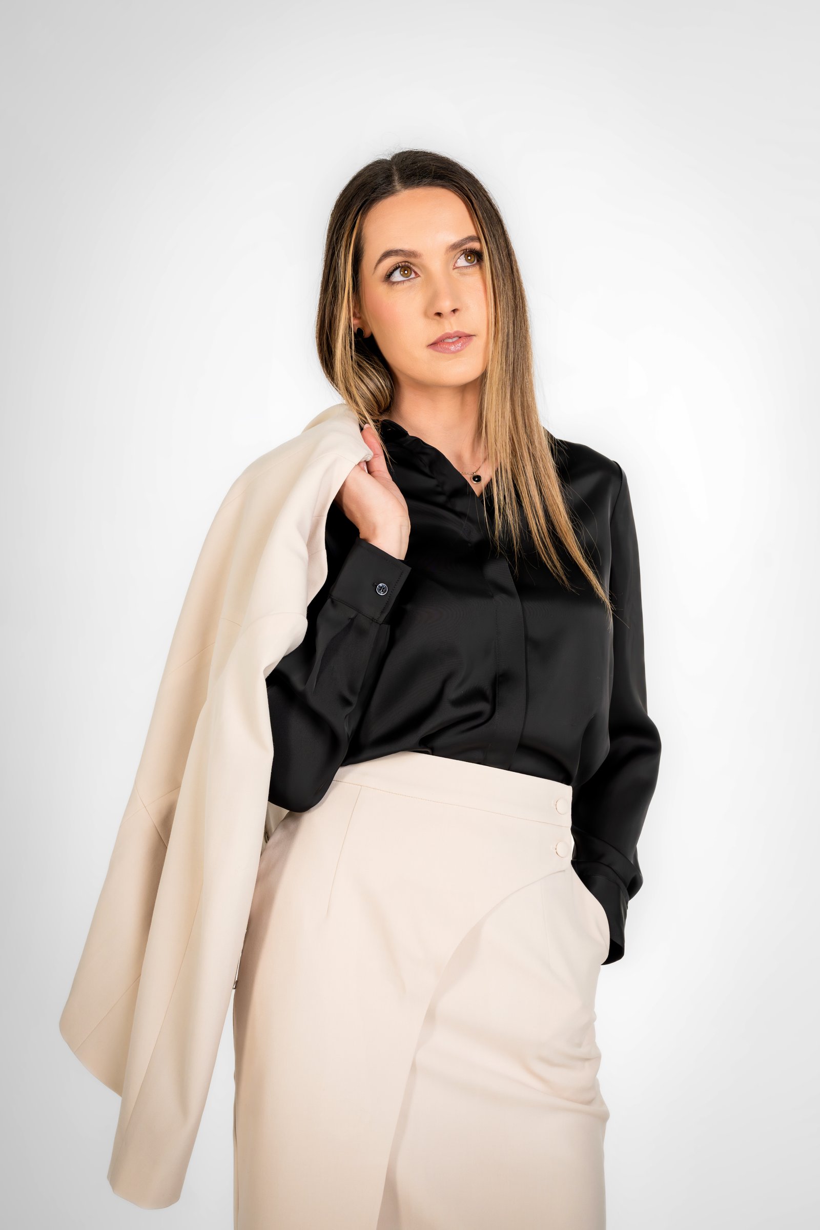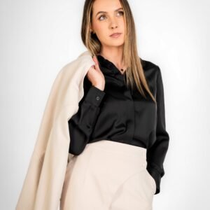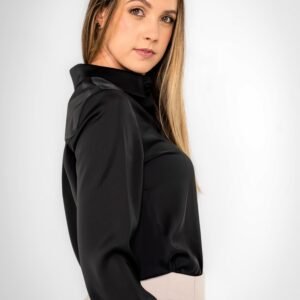 The classic collared neckline and long-sleeve design make it an ideal choice for both professional and after-hours looks. Its lightweight drape enhances comfort and movement, while the minimalist tailoring delivers a sleek, body-flattering silhouette. Whether tucked into tailored trousers or paired with a pencil skirt, this versatile shirt embodies modern femininity with an executive edge.