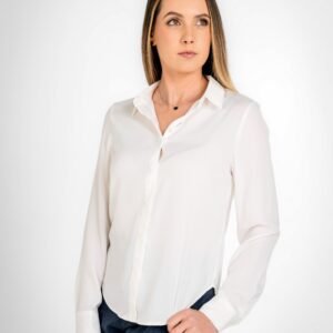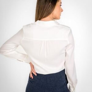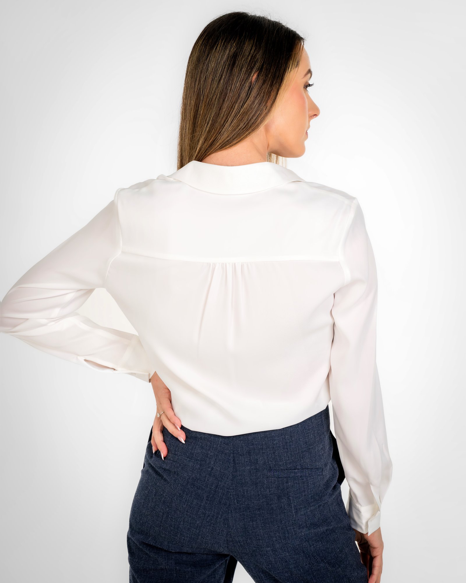The classic collared neckline and long-sleeve design make it an ideal choice for both professional and after-hours looks. Its lightweight drape enhances comfort and movement, while the minimalist tailoring delivers a sleek, body-flattering silhouette. Whether tucked into tailored trousers or paired with a pencil skirt, this versatile shirt embodies modern femininity with an executive edge.